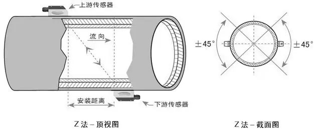 在遇到管道比较大,又比如说液体里面有着悬浮物、管到的内壁结垢很厚或者衬里太厚这些因素,导致了我们使用V法安装没有信号,就没法正常工作,这时候就采取外夹式超声波流量计的Z安装方法。Z安装法的特征就是超声波在管道中里直接进行传输,没有反射就叫做单声程,信号损耗就小。Z安装法可以计量口径范围通常是DN100-DN6000。实际安装时大于200的都应该用该方法来进行安装。