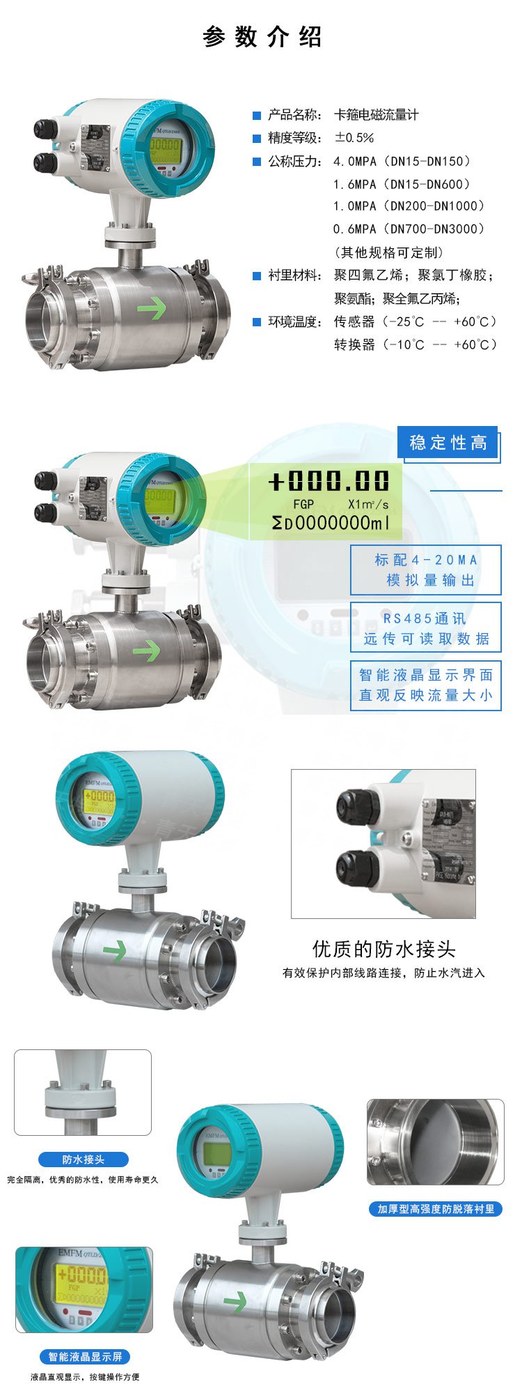 卫生型卡箍式电磁流量计采用了新型的卫生型衬里材料和衬里工艺,符合食品行业的卫生要求,同时采用了不锈钢外壳及不锈钢卡箍连接,方便电磁流量计的快速拆卸、清洗,使电磁流量计在使用过程中不易被污染,且能有效防止测量流体残余物在测量管中的堆积,可广泛应用于矿泉水、酱油、果酱、啤酒、果汁、米酒、牛奶等食品的生产制造过程及卫生、化工等领域。
